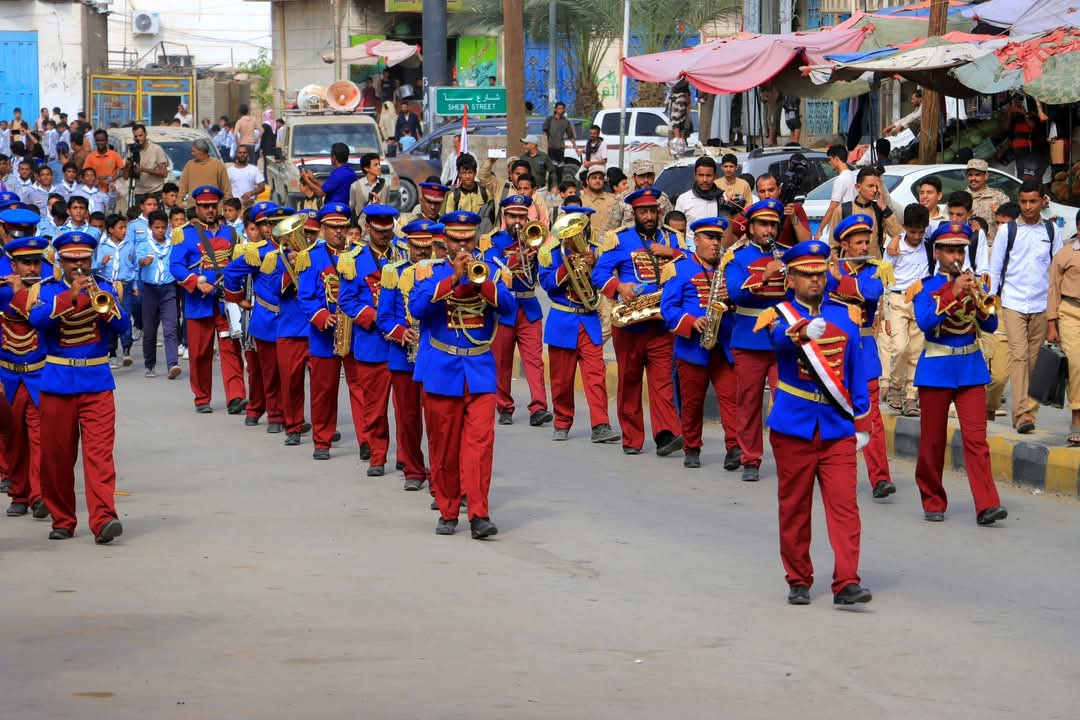 وانطلقت المسيرة من جولة البنوك، مروراً بعدد من شوارع المدينة، حيث عزفت الفرقة الموسيقية العسكرية الأناشيد الوطنية والأغاني الفرائحية، فيما ردد المشاركون الهتافات والأناشيد تعبيراً عن فرحتهم بهذه المناسبات الوطنية.